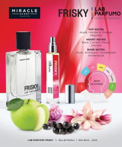 กลิ่นแห่งความสุข ความสนุกสนาน ร่าเริง สดใส ไม่เคร่งเครียด มีชีวิตชีวา อาจสามารถแสดงออกผ่านพฤติกรรม แต่ที่ Lab Parfumo เราส่งผ่านความรู้สึกนั้นผ่านกลิ่นที่ทำให้เกิดความรู้สึกพร้อมที่จะเผชิญปัญหาทุกอย่างระหว่างวัน และ FRISKY ยังแฝงไปด้วยความน่ารัก ขี้เล่น FRISKY กลิ่นที่จะกระตุ้นความรู้สึกเชิงบวก และปฏิสัมพันธ์ที่ดีกับคนรอบข้าง
